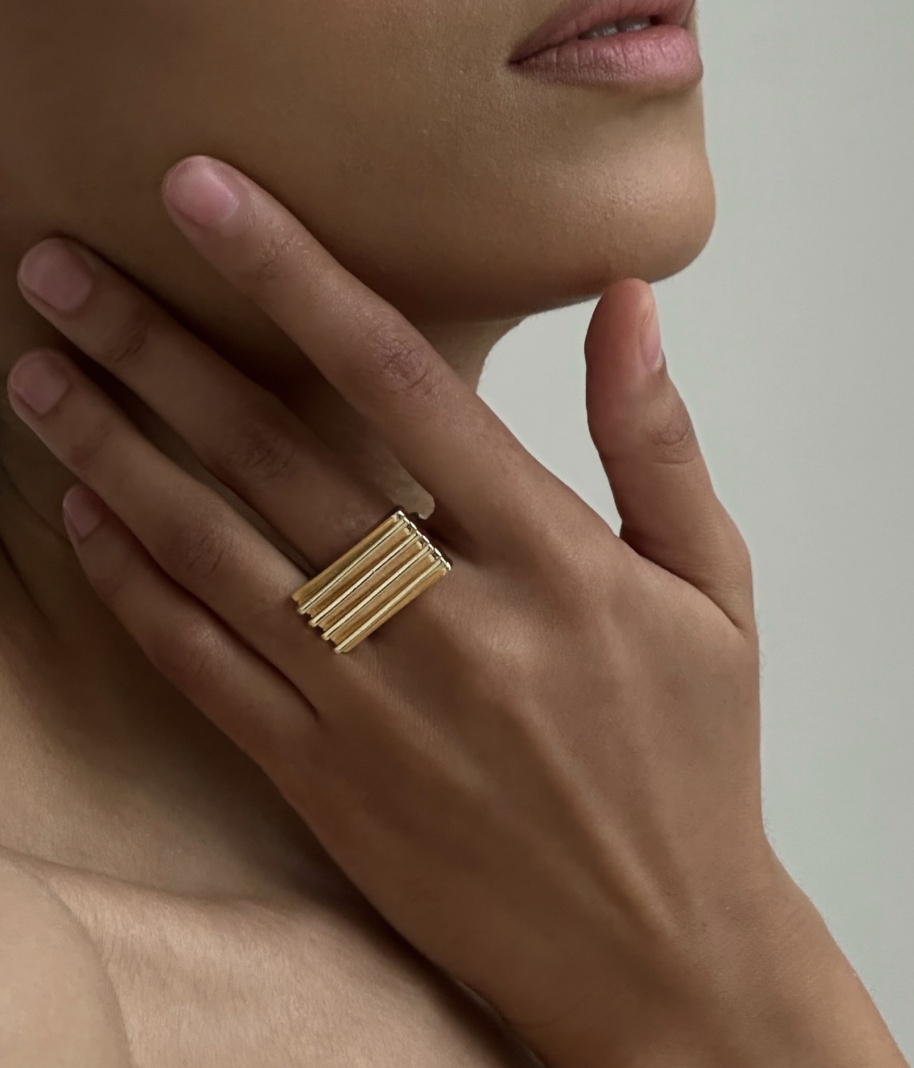 Кольцо с прямоугольником в полоску золотистое s