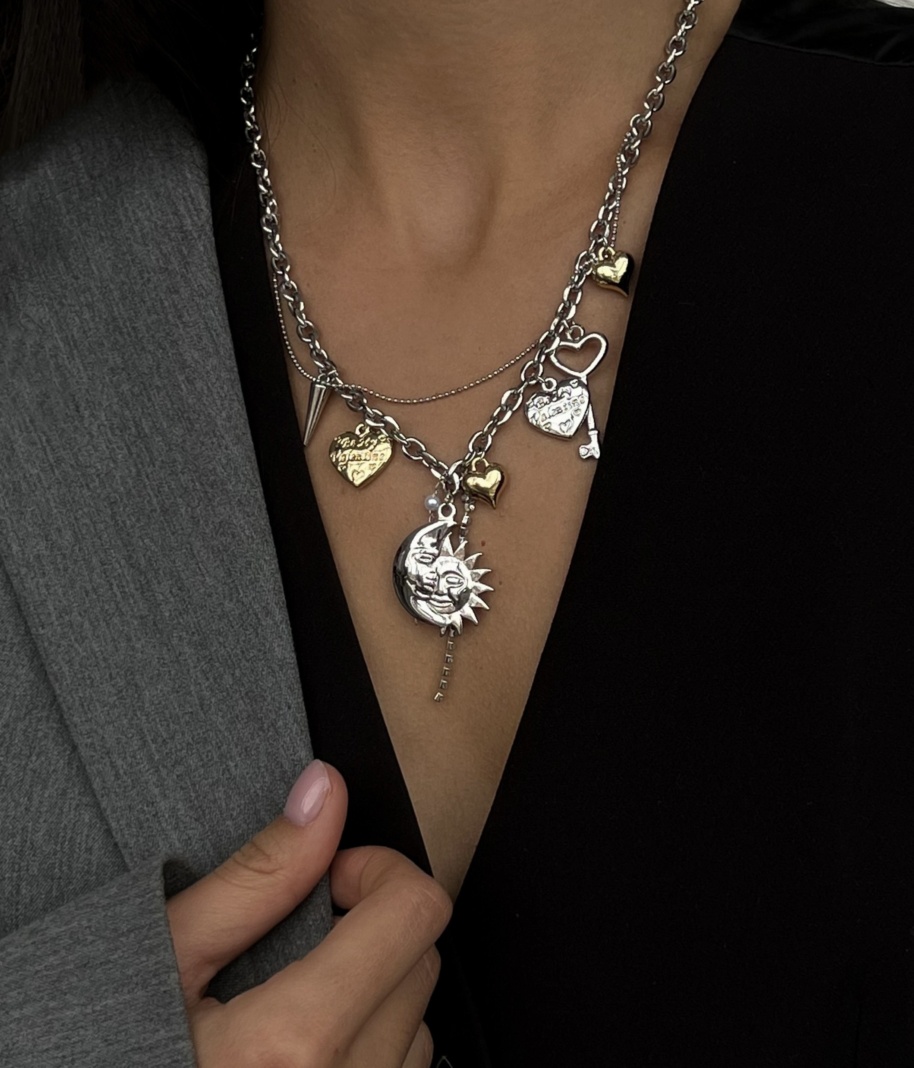 Высота подвесок: месяц с солнцем 3 см; ключ 3 см; сердце 1.5 см; сердце 1 см; конус 1.5 см; нить с цирконами 5 см